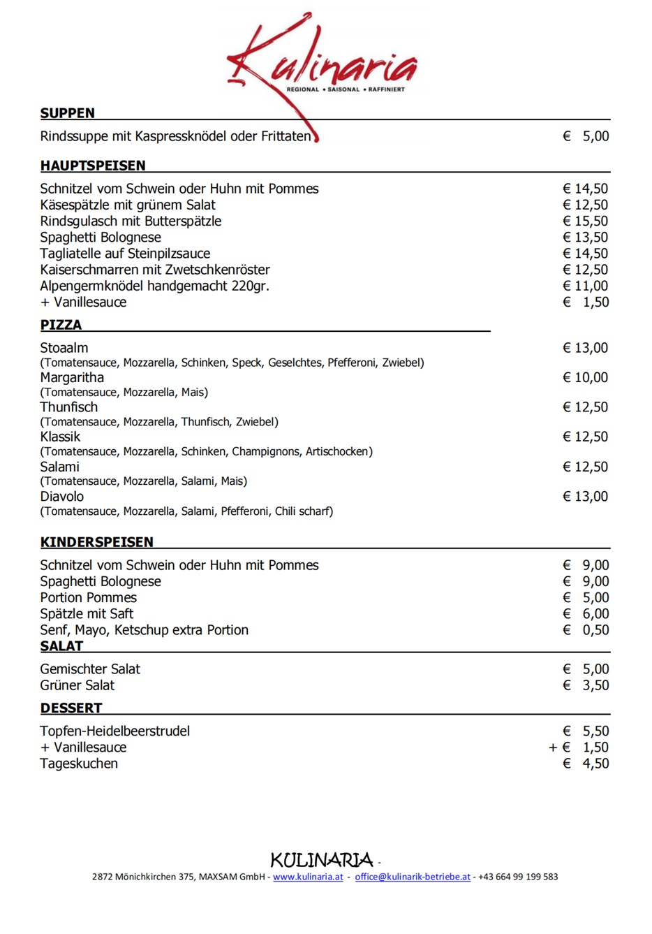 An der Talstation Mönichkirchen, direkt am Lift gelegen, präsentiert sich unser mit April 2023 eröffnetes Restaurant Kulinaria. Erleben Sie Kulinarik vom Feinsten, Momente zum Wohlfühlen und Genießen, in der gemütlichen Atmosphäre unseres modernen Restaurants. Nur eine Autostunde von Wien und Graz entfernt bietet das Erlebnisparadies Mönichkirchen-Mariensee im Sommer wie auch im Winter Abenteuer und Entspannung für die ganze Familie – und das Kulinaria, als Familienbetrieb, bietet den perfekten kulinarischen Rahmen für Ihren Ausflugstag! Regionale und saisonale Köstlichkeiten werden von unserem erfahrenen Küchenteam raffiniert und liebevoll zu verführerischen Gerichten kombiniert. Ob für den großen oder kleinen Hunger, ob Steak oder vegetarisches Schmankerl – die kulinarische Vielfalt des Kulinaria trifft jeden Geschmack.